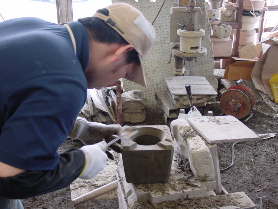 帰りも転ばないように注意しながら,どうにか出口にでた。ついでに,コンロの工場へもよることにした。職人さんがノミで彫っているところだった。