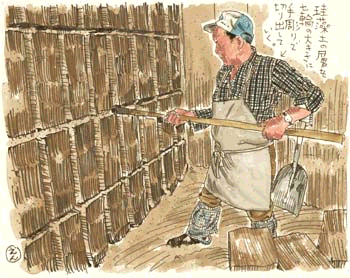 「壁一面を平らに削り落とし、表面に格子状に線を引いて溝を彫っていく。溝の深さは約50センチ。それが七輪の高さになる。溝を彫り終わると、背面だけが壁につながった四角い塊が格子状に並ぶ。クサビを打ち込んで、塊をはずしていく。昔ながらの手作業。1段分で、ほぼ1日が終わる。生瀬さんは、もう50年この仕事を続けてきた。「モグラみたいに、よく穴ばかり掘ってきたもんだ!」(引用者註:生瀬さんというのは,珠洲の別の職人さんである)。