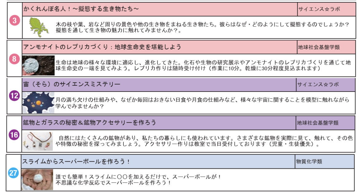 あと,最近の主要メンバーのRさん(小学3年)が,金沢大学で開催された「ふれててくてく」(サイエンス&テクノロジー/ふれてく2025)というイベントに参加してきたことを発表してくれました。お父さんが見せてくれたその時の画像を指し示しながら,石の展示がよかったらしく,うれしそうに話してくれました。また今回はRさんのお気に入りの一冊として『物語のある鉱物図鑑』(三才ブックス/\1800+税)も紹介してくれました。Rちゃんが参加したのは,次のようなブース。