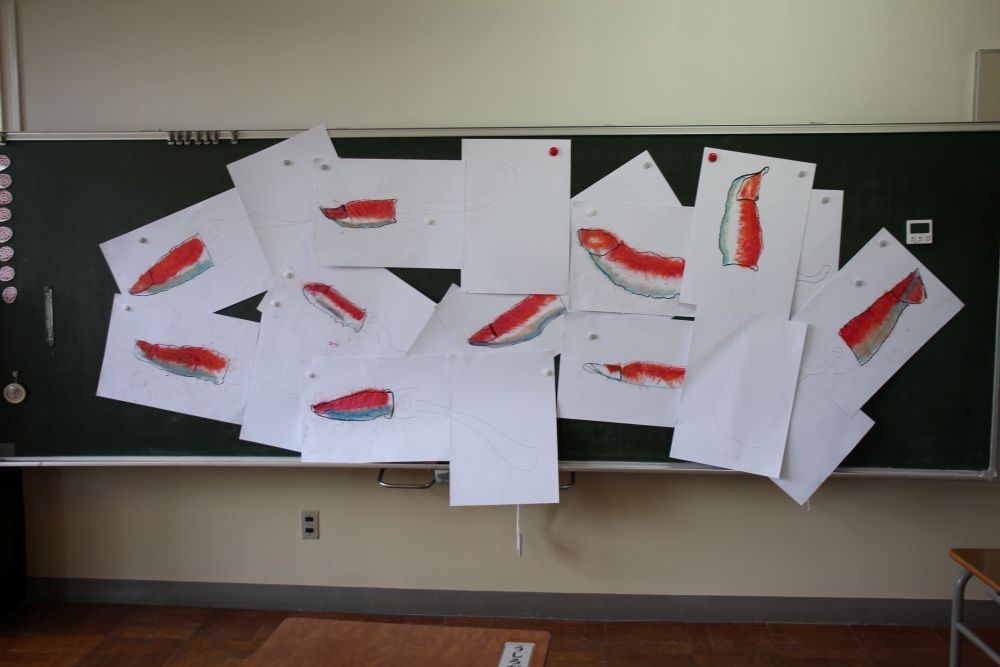 授業のスタートも,その完成品を見せ「みんなもこれぐらいは描けると思います」と制作工程をパワーポイントで見せてから始めたそうです。その後も「では,やってみます」と子どもたちを自分の近くによせ,〈ひと工程実演〉してから「さぁ,自分でもやってごらん」を繰り返して,子どもたちの作品も完成させたそうです。