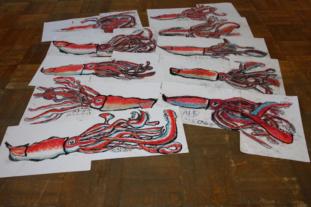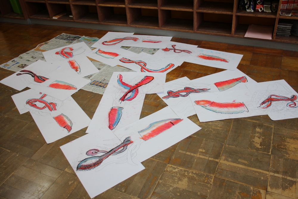 1年生8名と担当学級の1名を対象に「クレパスでイカキング」をかいてもらった取り組みを,制作途中の写真を取り入れ,丁寧に説明されました。
