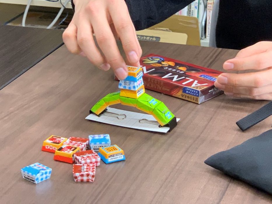 あわせて,バレンタインの時期恒例のチロルチョコでのアーチ作りも実施。「上に乗ったチョコはプレゼント」と伝えると熱心に挑戦し、最高14個を乗せて構造の強さに驚いていたそうです。サークルでもやってみましたが,まずは,なかなか橋ができない。そのうち,橋を作るコツが分かってくると,俄然,楽しくなるのでした。子どもたちはチームを組んでやってもいいことにしたそうです。その代わりゲットしたチョコも等分することになりますがね。