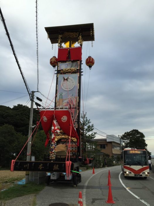 中でも,この寺家地区のキリコは一番高いキリコです(隣のバスとくらべてみてください)。約16.5m,4t。こうなると,もう担ぐことはできないので,4輪のタイヤが付いています(^^;)
