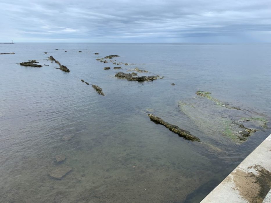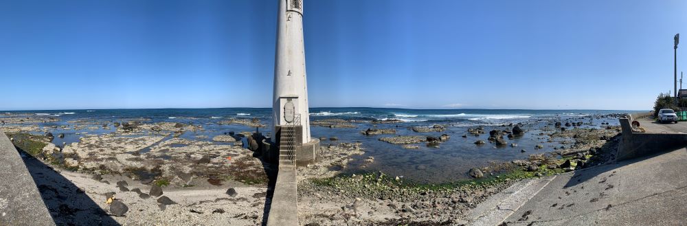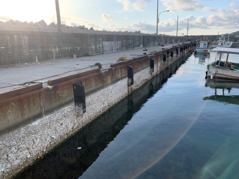 寺家漁港へ行くと,堤防の海面が下がっているのに気がつきます。これまで海面の下だったところには貝が付いていた白い跡があります。これを見ると,30㎝くらいは隆起しているのではないかと思います。港の外側を見ても,今まで海の下だったところが海面に顔を出していました。