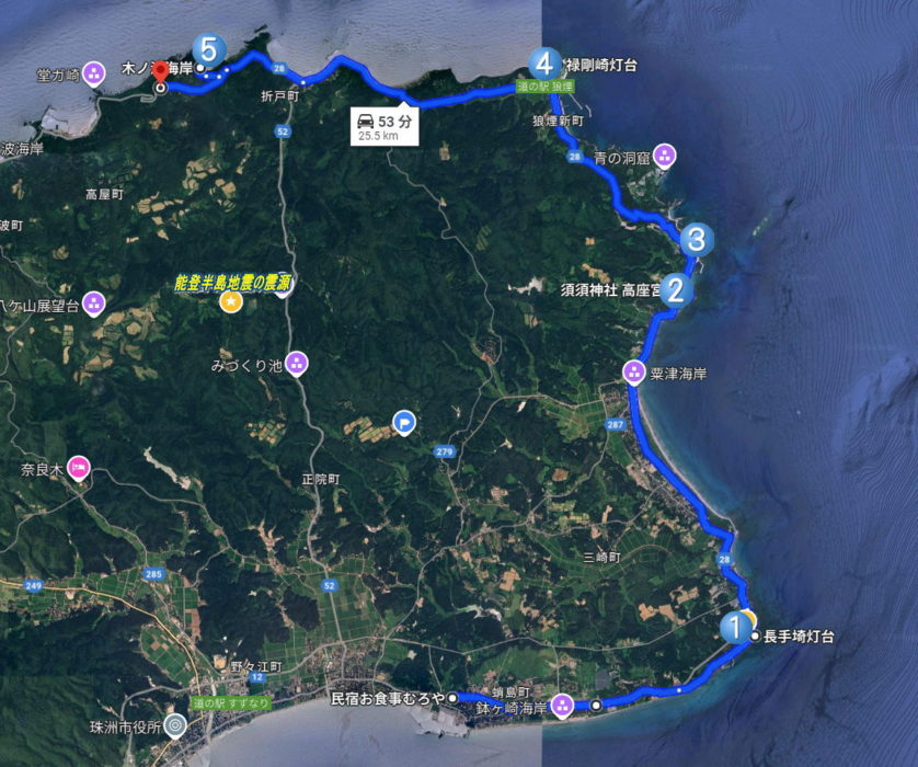 途中の「長手埼」というのは,珠洲市最東端の岬です。このあたりの地盤も少し隆起したようで,以前よりも灯台の周りに陸地が増えていました。写真はいずれも,2024年4月10日撮影。