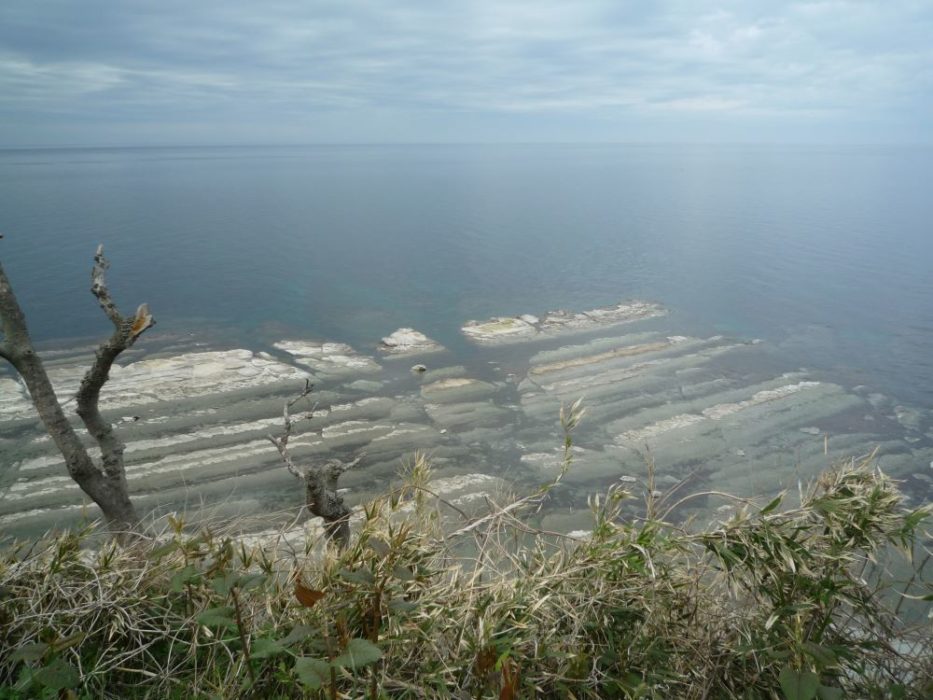「燈台の下あたりをとりまいて,海面すれすれに,波食台が見られます。泥岩層のなかのとくにかたい部分が突出して,「洗濯板」のような縞目になっています」(絈野義夫編著『日曜の地学6 北陸の地質をめぐって』(築地書館,1979),144ぺ)