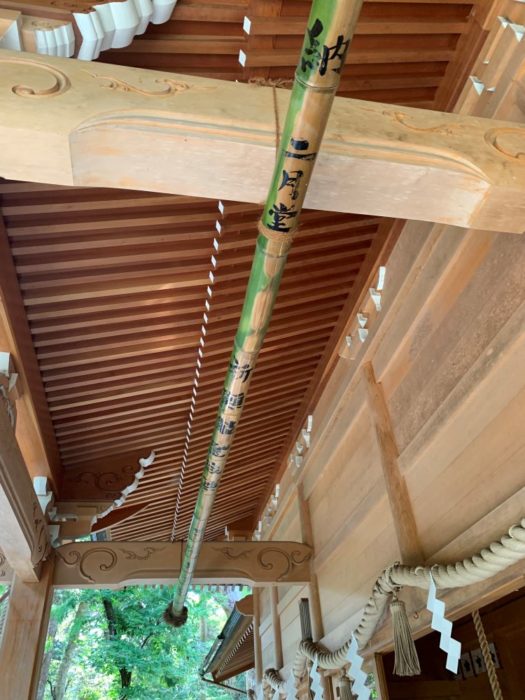 拝殿の軒下には,何やら記念の竹が飾られていました。さだまさし…などどいう名前が…。